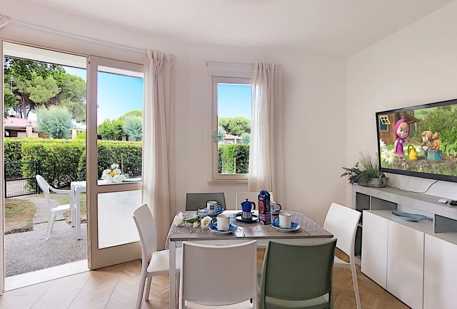 | Comments | Bibione Spiaggia, Via Reghena 600m from the beach, 300m from the city center, 5 minutes walk from shops and restaurants. Small and quiet holiday village with swimming pool for adults and children. Semi detached houses with private garden with barbeque. Numbered car parking facilities. • Type C1 4/5+2 : with 2 sleeping rooms and private garden • Ground floor: living room with double sofa bed and kitschen corner • 1st floor: • 2 double rooms • Private garden with barbeque • Numbered car parking facility • Bathroom with shower cibicle and window • Free Wi-fi • Air conditioning , refrigerator with freezer, sat-tv, micro wave, washing machine coffee machine, electric kettle |